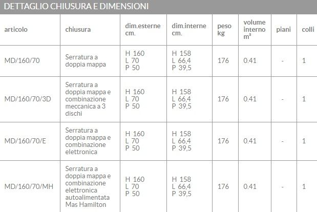 Per tutti i modelli il sistema può essere integrato da combinazione numerica a 3 dischi coassiali formante un milione di combinazioni, da combinazione elettronica, oppure da combinazione elettronica autoalimentata "Mas Hamilton". Le suddette serrature sono protette da una piastra di acciaio al manganese imperforabile al trapano.