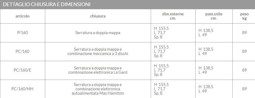 - Chiusura azionata da maniglia e rifermata da serratura di sicurezza a doppia mappa più eventuale combinazione meccanica od elettronica (Certificate EN 1300)