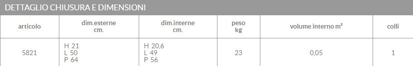 CARATTERISTICHE TECNICHE La struttura è realizzata in lamiera di acciaio speciale di 1a scelta S235JR, dello spessore di mm. 2. Lo sportelloè formato da frontale e sopra apribile verso l'alto a 90°, tenuto in posizione da pistone a gas. Sistema di chiusura con serratura di sicurezza a doppia mappa. Il sistema può essere integrato da ritardatore di apertura. Sulla parete posteriore ci sono fori per passaggio cavi, persianine di aerazione par la circolazione naturale dell'aria ed elettroventola diam. mm. 120. Persianine di aerazione par la circolazione naturale dell'aria anche sulle fiancate laterali.