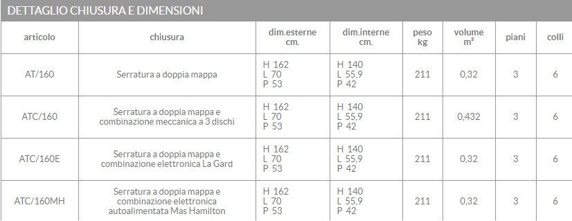 CARATTERISTICHE TECNICHEGrazie alla loro struttura, realizzata con una doppia parete all'interno della quale è compresso un materiale ad alto potere isolante, garantiscono un'efficiente protezione agli sbalzi termici provocati da piccoli incendi o esposizione a fonti di calore. L’armadio è realizzato in lamiera di acciaio speciale di 1a scelta S235JR, dello spessore di mm.3 ed internamente, ad eccezione della parete posteriore, abbiamo una pannellatura in lamiera di acciaio dello spessore di mm.1 che rende invisibili tutti i bulloni di montaggio. Le cerniere degli sportelli sono predisposte internamente allo sportello, rendendole non accessibili allo scasso (ns. brevetto n. 205519 del 1983). Il sistema di chiusura è composto da cremagliera a triplice espansione azionante 4 catenacci orizzontali, uno verticale superiore ed uno verticale inferiore diam. mm. 22 e 2 barre laterali di incastro fiancata-sportello. Il sistema è azionato da una maniglia frizionata che in caso di forzatura oltre certi limiti slitta evitando di rovinare il sistema stesso. Riferma realizzata con serratura a chiave femmina a doppia mappa a 8 leve con chiave non estraibile ad armadio aperto. Il sistema può essere integrato da combinazione numerica a 3 dischi coassiali formante un milione di combinazioni, da combinazione elettronica, oppure da combinazione elettronica autoalimentata "Mas Hamilton".Le suddette serrature sono protette da una piastra di acciaio al manganese imperforabile al trapano.