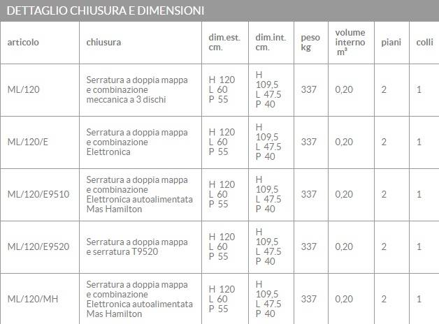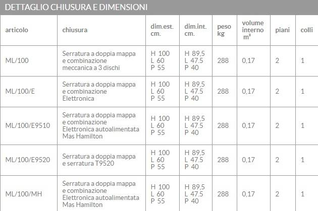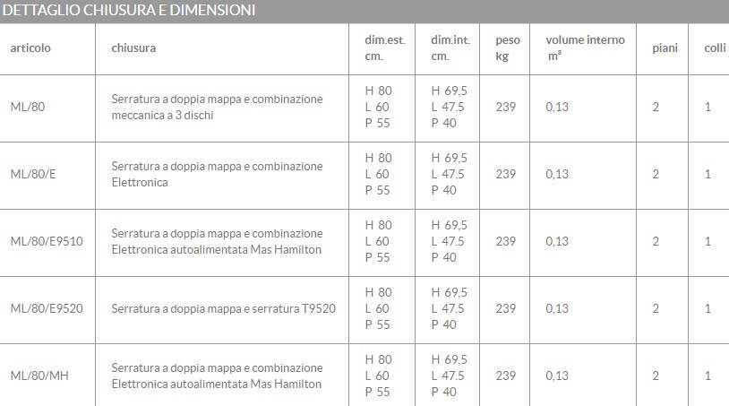 Le casseforti certificate in grado II della serie MOLLY vengono realizzate in lamiera di acciaio M.S. e sosno costruite con doppie pareti unite fra loro con appositi rinforzi di collegamento ed internamente blindature ad altissima resistenza. Hanno un sistema di chiusura a triplice espansioni azionante 4 catenacci orizzontali e 2 verticali di diam. 22. Il sistema è azionato da una maniglia frizionata e rifermata con serratura di sicurezza a doppia mappa certificata (VDS KL.1 - EN 1300 CL.A) e combinazione numerica a 3 dischi coassiali formante un milione di combinazioni,oppure da combinazione elettronica. Le due riferme, con un doppio sistema indiretto, lavorano indipendenti l'una dall'altra. Il sistema di chiusura, la serratura e la combinazione sono protette da piastre di acciaio al manganese. I cardini dello sportello sono posizionati esternamente ed hanno la sola funzione di rotazione dello sportello, mentre la sicurezza del battente sul lato cardine è assicurata da un profilo antistrappo ad incastro che unisce la porta con il fianco destro.