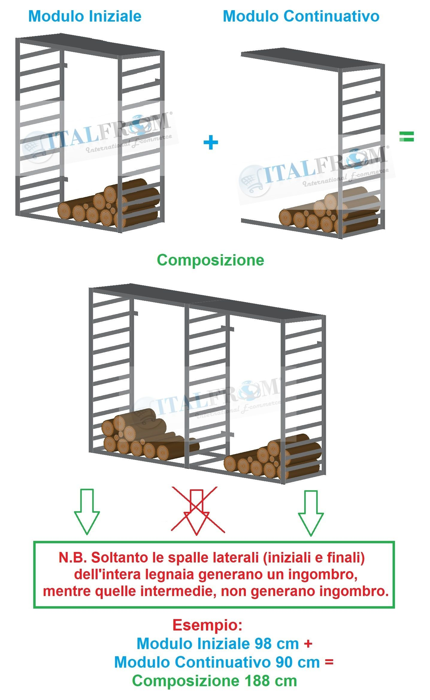 La Legnaia Modulare con Staffa a Parete ITALFROM® in acciaio zincato è una produzione e progettazione 100% Italfrom® - Made in Italy. Questa struttura aperta atta a proteggere la vostra legna da ardere dalle intemperie. Grazie anche alla sua modularità, riusciamo a garantire una molteplicità di misure standard a scelta, come indicato dal menu a tendina sopra e che di seguito vi riportiamo :