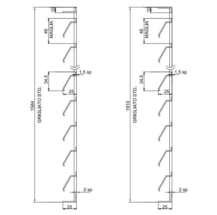 I profili verticali sono dotati di opportune forature al fine di creare un supporto per il fissaggio alle piantane. Le bordature sono saldate ai profili verticali mediante procedimento di elettrosaldatura con apporto di materiale.