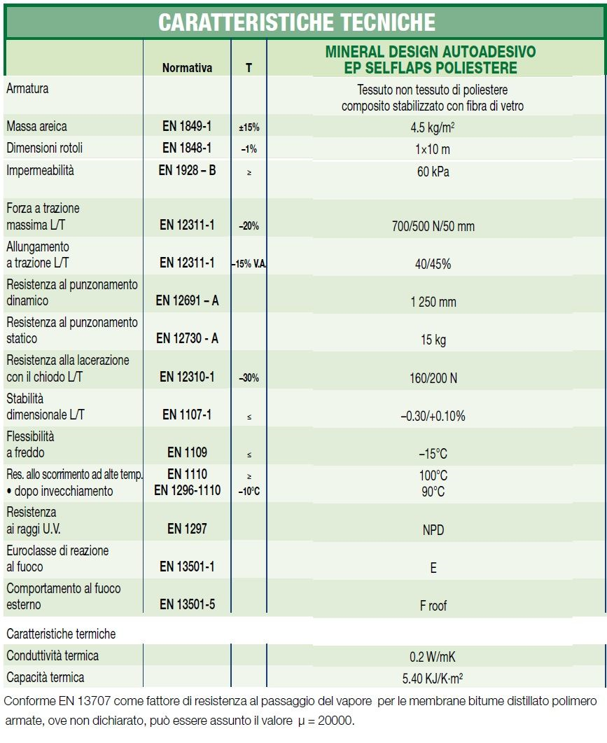 MINERAL DESIGN AUTOADESIVO EP SELFLAPS POLIESTERE è una membrana in cui la cimosa è autoadesiva e può essere saldata senza l’utilizzo della fiamma. È destinata unicamente alla posa su tavolato di legno e su superfici di limitate proporzioni, inferiori a 200 m2. Per stabilizzare ulteriormente la zona del sormonto e limitare le tensioni che potrebbero sollecitarlo si è ritenuto opportuno produrre MINERAL DESIGN AUTOADESIVO EP SELFLAPS POLIESTERE con un bordo sabbiato di 3 cm ca. per consentire un fissaggio meccanico con chiodi o cambre prima di asportare la fascia protettiva siliconata della cimosa autoadesiva e di sigillare la sovrapposizione.