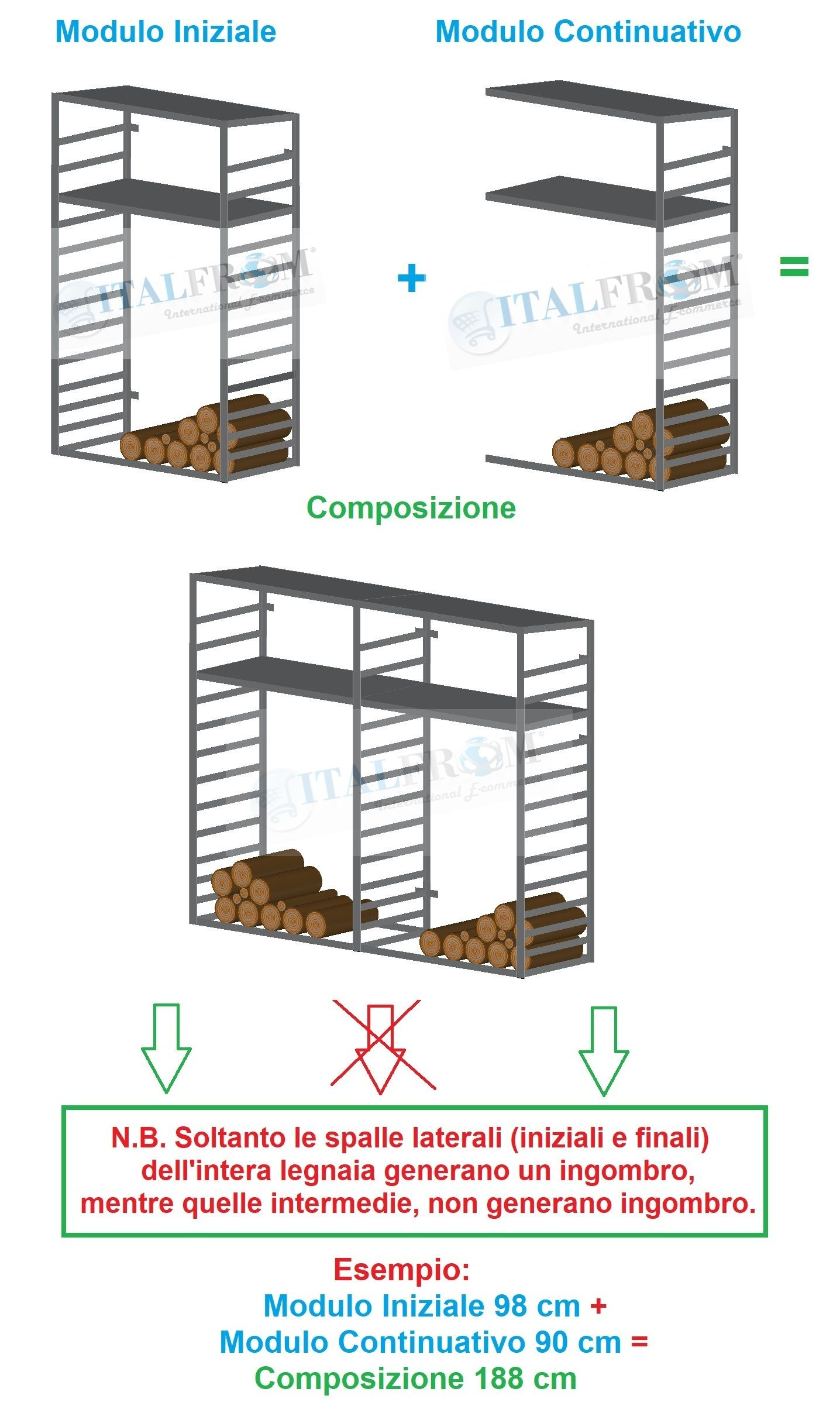 VANTAGGI E UNICITA' DELLE LEGNAIE ITALFROM: 1) Praticità e velocità nel montaggio e smontaggio; dato il sistema di montaggio interamente ad incastro, si può tranquillamente montare in inverno e smontare in estate non occupando lo spazio del vostro giardino in maniera permanente come gran parte delle legnaie sul mercato. Inoltre una volta smontato il prodotto occupa pochissimo spazio e può essere riposto in qualsiasi angolo della casa o del giardino. 2) Versatilità di Montaggio grazie la natura componibile delle nostre legnaie, è possibile in fase di montaggio , scegliere la pendenza del tetto a vostro piacimento quindi farlo pendere o dalla parte frontale oppure dalla parte della parate , tale disposizione di montaggio naturalmente potrà essere modificata con praticità secondo le singole esigenze anche nel tempo 3) Le legnaie ITALFROM® sono componibili e modulari, si possono aggiungere moduli di varie misure secondo le singole esigenze e anche ripiani per utensili e attrezzi. 4) Le legnaie ITALFROM® hanno una scelta di moduli e misure standard vastissima secondo le singole esigenze ottimizzando al massimo gli spazi per la vostra legna. 5) Le legnaie ITALFROM® sono in acciaio zincato e non subiranno nessun mutamentonel tempo, facendo risparmiare tempo e denaro per la manutenzione come le classiche legnaie in legno. 6) L' estetica e il design delle legnaie ITALFROM® è unica ed inconfondibile, apprezzata e ricercata in Italia ed in Europa. 7) Vastissime disponibilità a magazzino, questo comporta Per voi Clienti: 1 Consegne immediate e 2 Prezzi Super vantaggiosi.