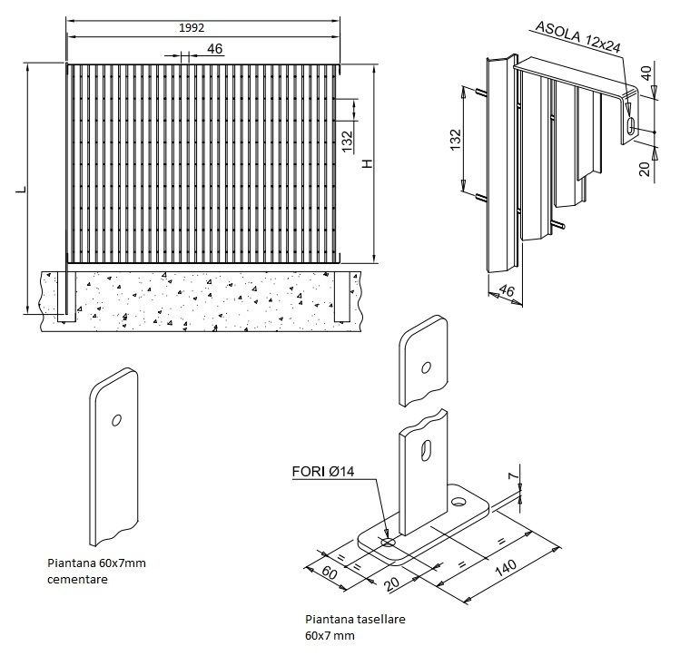 Le piantane sono costruite in piatto da 60 mm avente spessore 7 mm, dotate di opportune forature per il fissaggio dei pannelli. o Per il fissaggio dei pannelli alle rispettive piantane, è prevista una bulloneria