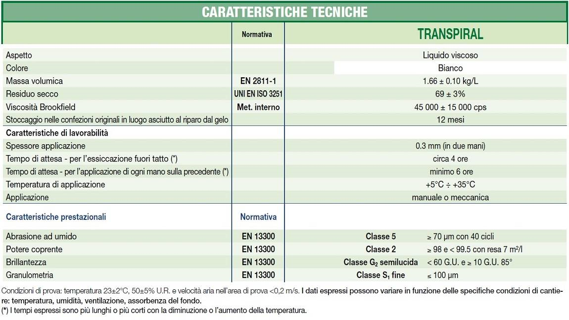TRANSPIRAL è una idropittura decorativa per superfici interne, a base di copolimeri vinilici in emulsione, pigmenti selezionati e cariche minerali ad alta copertura. Dopo essiccazione forma un film caratterizzato da elevata permeabilità al vapore e buona copertura.