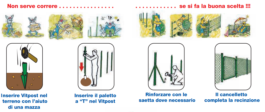 Vitpost è la soluzione di posa eccezionalmente semplice, che non danneggia il prato già esistente e che non necessita di praticare pre-fori o attendere che il cemento solidifichi. In poco tempo senza fatica si recinta in modo facile, ma soprattutto economico, un grande spazio