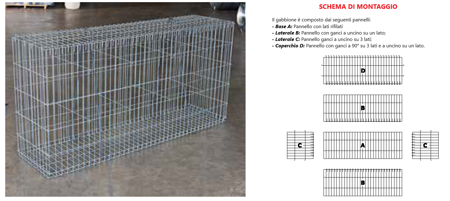L’utilizzo di una maglia elettrosaldata con uno spessore del filo maggiore di quello utilizzato nella produzione dei gabbioni standard con rete a doppia torsione, conferisce al manufatto una configurazione rigida, assolvendo al meglio alle funzioni statiche di competenza.