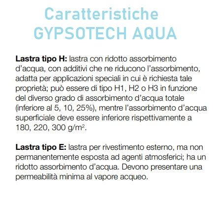 Le lastre Gypsotech AQUA tipo EH2 sono composte da uno strato di gesso ( Solfato di Calcio bi-idrato ) additivato con additivi specifici e sostanze idrorepellenti che ne riducono la capacità di assorbimento d'acqua, incorporato fra due fogli di cartone speciale ad alta resistenza.