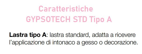 Lastra base per normale utilizzo Gypsotech STD (Tipo A secondo EN 520). Strato di gesso ( Solfato di Calcio bi-idrato ) con additivi specifici, incorporato fra due fogli di cartone speciale ad alta resistenza.