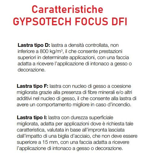 Lastra Gypsotech FOCUS (Tipo DFI secondo EN 520) a coesione del nucleo di gesso migliorata nei confronti dell'incendio, grazie alla presenza di additivi speciali nel nucleo di gesso, fibra di vetro e vermiculite.