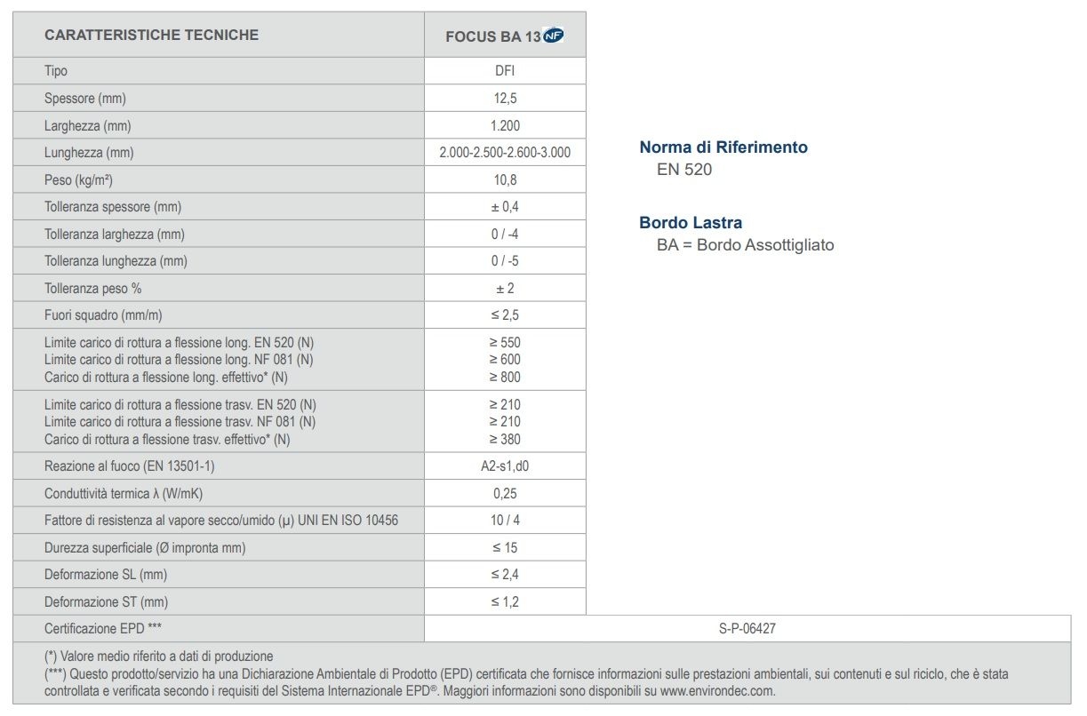 Le lastre Gypsotech FOCUS, prodotte secondo la normativa EN 520, sono in classe europea di reazione al fuoco A2, s1 - d0. Esse hanno le seguenti caratteristiche: