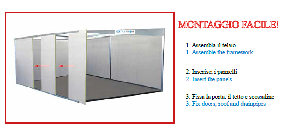 Pareti esterne: Realizzata in pannelli coibentati sp. 40 mm, composti da supporti in acciaio zincato preverniciato