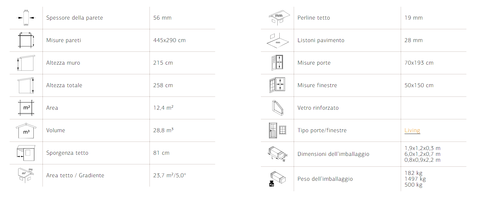 Le caratteristiche generali di qualità delle nostre casette da giardino • Pareti di profilati con taglio Chalet per angoli resistenti al vento ed alla pioggia. • Lingua(guarnizione) doppia con pareti spesse da 34 mm in su per garantire una casa più calda. • Solo tetti e assi del pavimento solido, la maggior parte di questi elementi hanno uno spessore di 19 mm. • Travetti per le fondamenta robusti e trattati per una costruzione solida e duratura. • Forti arcarecci per il tetto, progettati in funzione del carico della neve. • Protezione contro le tempeste per giorni di vento: tutori per il vento o barre filettate. • Un kit di montaggio completo (incluso il cappuccio del tetto per casette progettate su misura) per il montaggio rapido. • Diversi padiglioni hanno le pareti e gli elementi del tetto pre-installati, che facilita e accelera significativamente l'installazione della casetta. • La qualità delle nostre porte e finestre è la migliore della sua classe: telai delle porte in legno lamellare, la soglia bassa della porta coperta di acciaio inox, finestre turn-tilt, vetri veri e larghi passaggi. Ogni prodotto è contrassegnato separatamente con il tipo di porte e finestre utilizzate nel modello. • Le confezioni delle casette includono manuali di installazione dettagliati in diverse lingue.