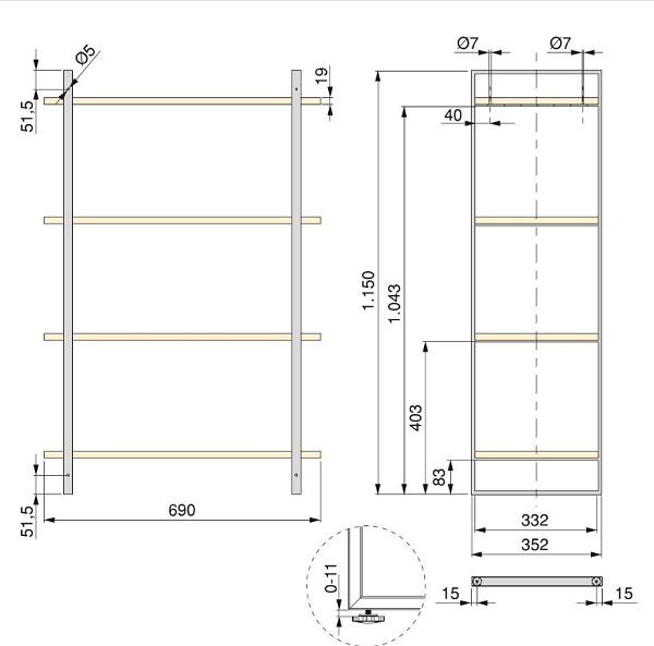 Scaffale composto da una struttura in acciaio e ripiani in legno per decorare qualsiasi stanza della casa, cucina, salone o bagno. Questo tipo di scaffale è concepito per creare degli originali design combinandoli tra loro. La struttura in acciaio è composta da due parti con stessa altezza di 1150 mm e larghezza di 350 mm, che consente una grande capacità di stoccaggio. Sono realizzate con un tubo in acciaio da 25x10 mm molto resistente, con piastre che fungono da traversa per collocare i ripiani. Tutta la struttura è laccata in finitura nera molto curata nei dettagli. Include 4 ripiani lunghi 690 mm, con spessore da 19 mm, realizzate con un pannello di qualità in finitura mogano. Il montaggio è rapido e facile, fissando la struttura alla parete grazie a dei fori praticati al profilo stesso. Inoltre, sono inclusi dei livellatori, nel caso in cui lo scaffale vada fissato al pavimento per fare in modo che la struttura sia perfettamente stabile. Sono inclusi tutti gli accessori necessari per il montaggio: 2 strutture, 4 ripiani in legno, viti e tasselli (Ø6x30) per fissare la struttura alla parete, viti Ø3,5x15 in finitura nera per fissare i ripiani in legno alla struttura, coperchi in plastica che nascondono il fissaggio dello scaffale alla parete alla parete e i livellatori