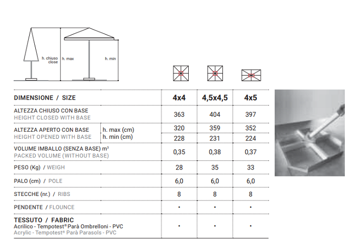 • Chiusura telescopica sopra i tavoli • Possibilità di fissaggio al suolo • Ombrellone standard fornito con pendente • Stecche intercambiabili • Parti metalliche prima zincate, poi verniciate • Inclusa Base + Carter Copribase in acciaio zincato verniciato
