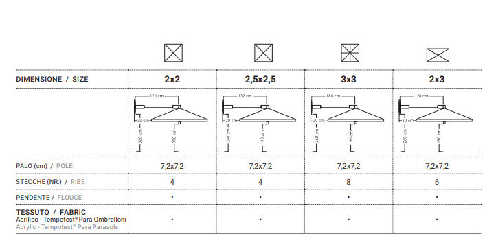 Tessuto Acrilico 100%, gr. 320 m/q, trattato antimuffa, idrorepellente e resistente agli agenti atmosferici, nei colori a scelta : ecru, corda o bianco.