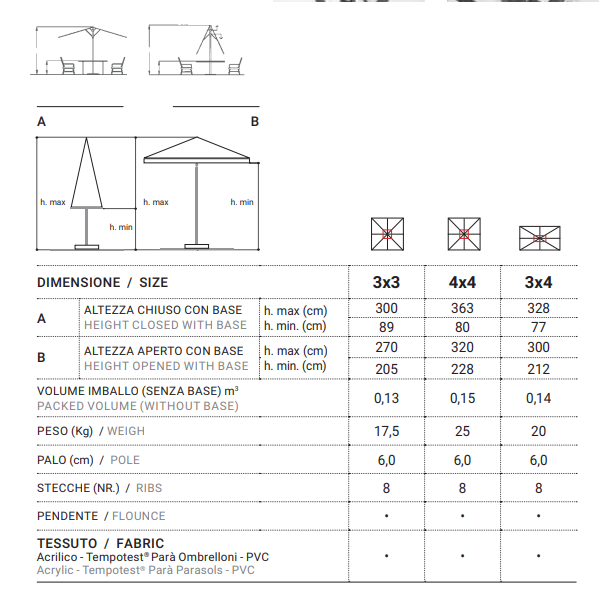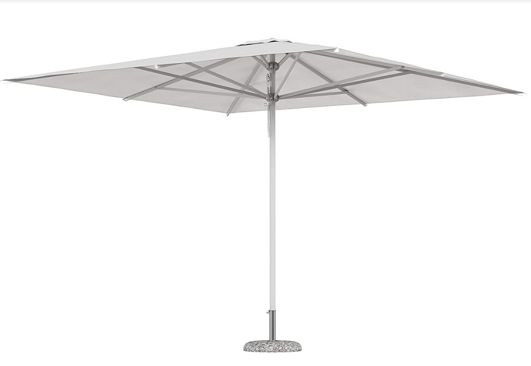 • possibilità di fissaggio al suolo • stecche intercambiabili • stecche diagonali 4x4 rinforzate • ombrellone standard fornito con pendente • sistema a doppio ragno che consente la chiusura sopra i tavoli sottostanti • completo di base + carter copribase Varianti colori struttura