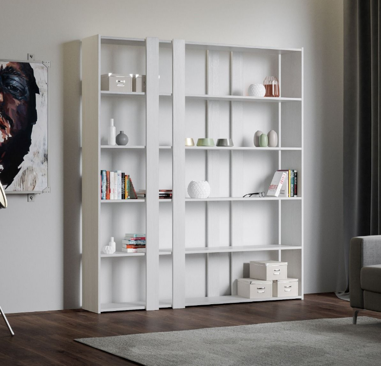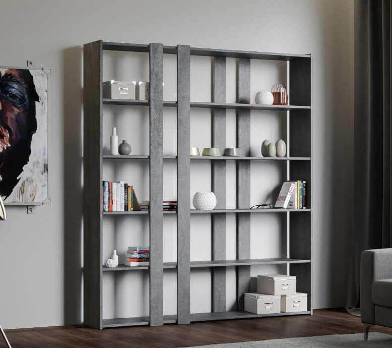 Libreria Kato A La libreria Kato viene proposta nella versione con 4 fasce, due nella parte anteriore, due nella parte posteriore e due fianchi di contenimento. Piani in microparticelle di legno disponibile nei colori bianco frassino noce e cemento. Realizzata interamente in Italia mediante l'utilizzo di materiali 100% italiani. Caratteristiche tecniche: 6 Ripiani orizzontali fissi e non regolabili Fasce verticali fisse e non regolabili La libreria è autoportante, ma per maggiore sicurezza consigliamo il fissaggio a muro con le staffe in dotazione. La libreria arriva smontata