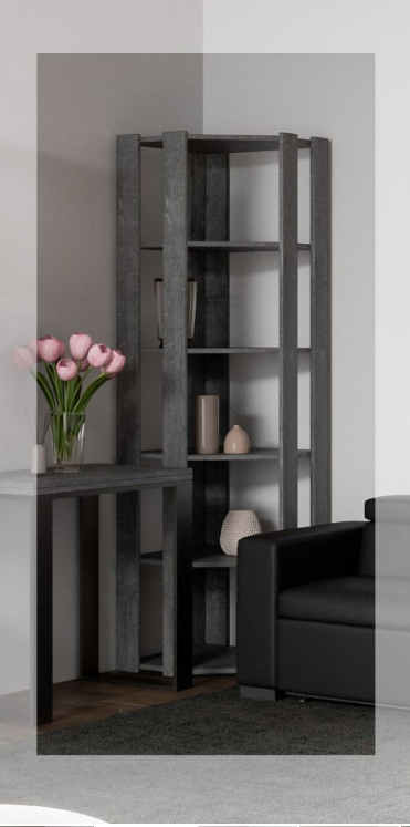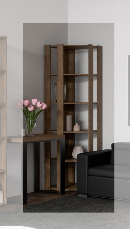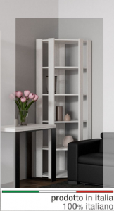 Libreria ad angolo con fianchi laterali a giorno. Senza schienale a parete. Abbinabile a tutte le librerie della linea KATO.