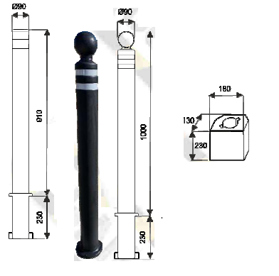 Dimensioni: diametro paletto 90 mm, altezza fuori terra 910mm, altezza complessiva 1140 mm.
