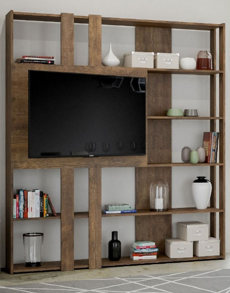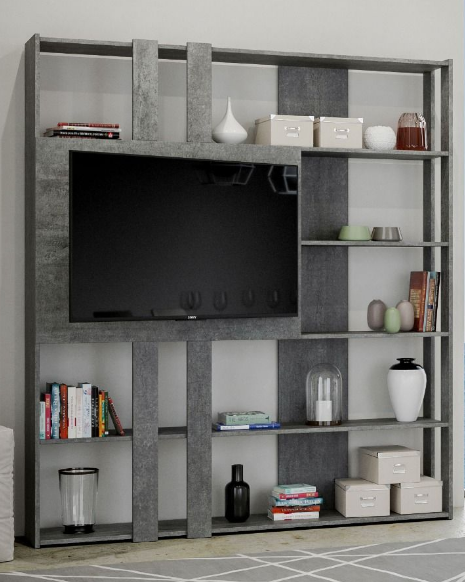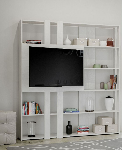 La staffa per agganciare la TV alla libreria è da acquistare a parte. Il pannello porta TV frontale è dotato di foro passacavi.