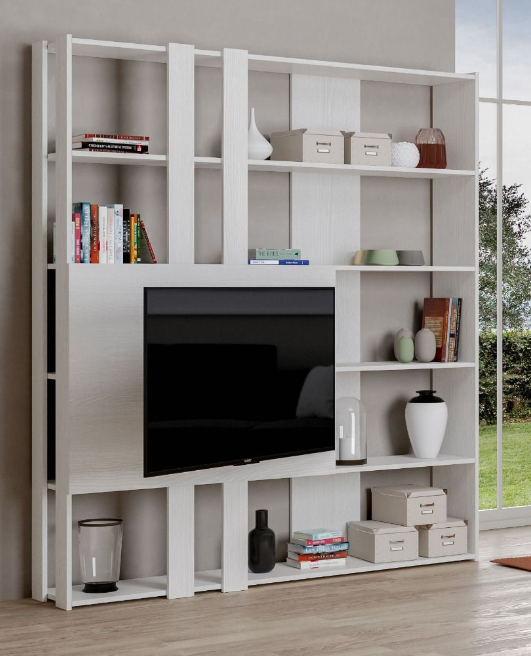 Durante la fase di montaggio, si può scegliere di avere il pannello TV a destra o a sinistra. La staffa per agganciare la TV alla libreria è da acquistare a parte. Il pannello porta TV frontale è dotato di foro passacavi. Il peso massimo supportato dal pannello porta TV è di 20 kg.