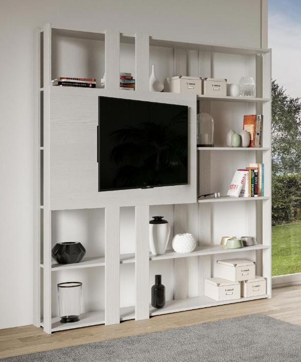 Libreria porta TV Kato N. TV e libreria insieme. I piani orizzontali sono particolarmente resistenti alla flessione essendo 'legati' alle fasce verticali. Durante la fase di montaggio, si può scegliere di avere il pannello TV a destra o a sinistra. I fianchi laterali sono entrambi aperti per una facile esplorazione del vano retrostante. La staffa per agganciare la TV alla libreria è da acquistare a parte. Il pannello porta TV frontale è dotato di foro passacavi. Il peso massimo supportato dal pannello porta TV è di 20 kg.