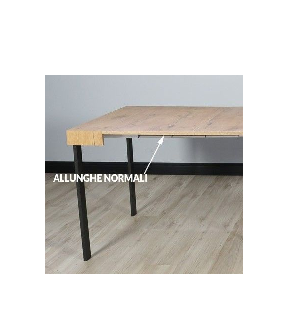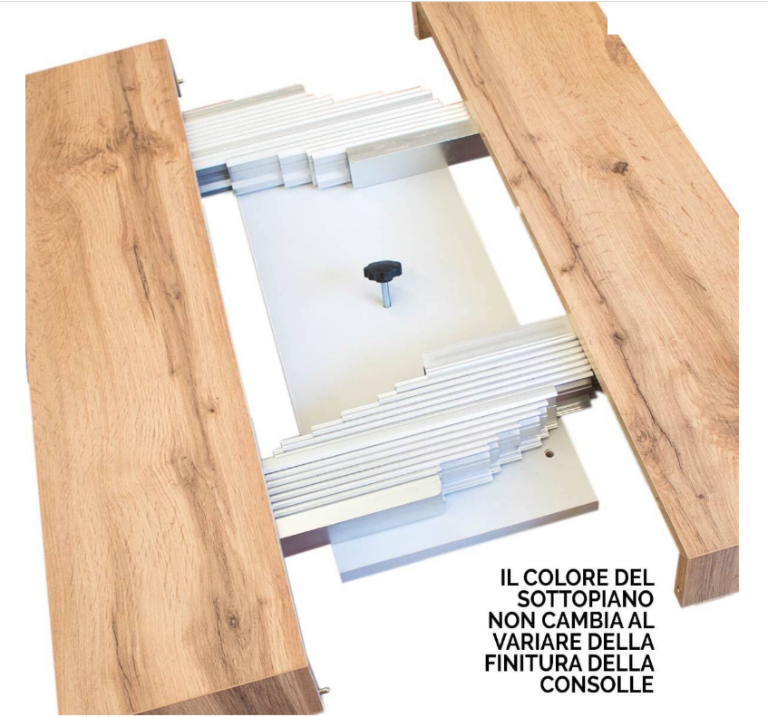 Presenta una solida struttura in metallo lavorato al pantografo che sorregge un robusto piano in abete, allungabile fino a 290 cm.
