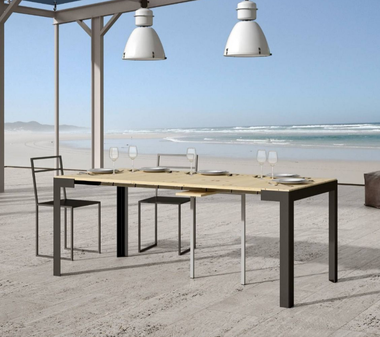 Una solida struttura in metallo lavorato al pantografo che sorregge un robusto piano in abete, allungabile progressivamente fino a 190 cm, grazie alle tre allunghe.