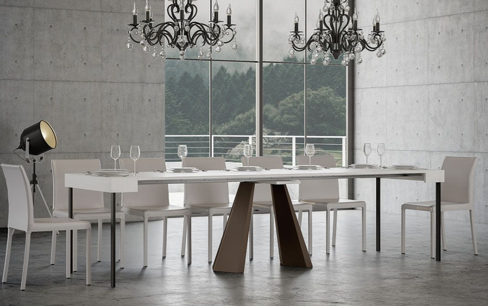 Caratteristiche tecniche: Il piano e le allunghe, nelle finiture bianco frassino, quercia natura, cemento, noce, marmo sono in microparticelle di legno rivestito, mentre il piano in abete natura e abete tinto è in legno listellare. I due sistemi di supporto (le gambe poste all'estremità quando la consolle è totalmente aperta) possono essere assemblati assieme per formare un carrello porta allunghe.