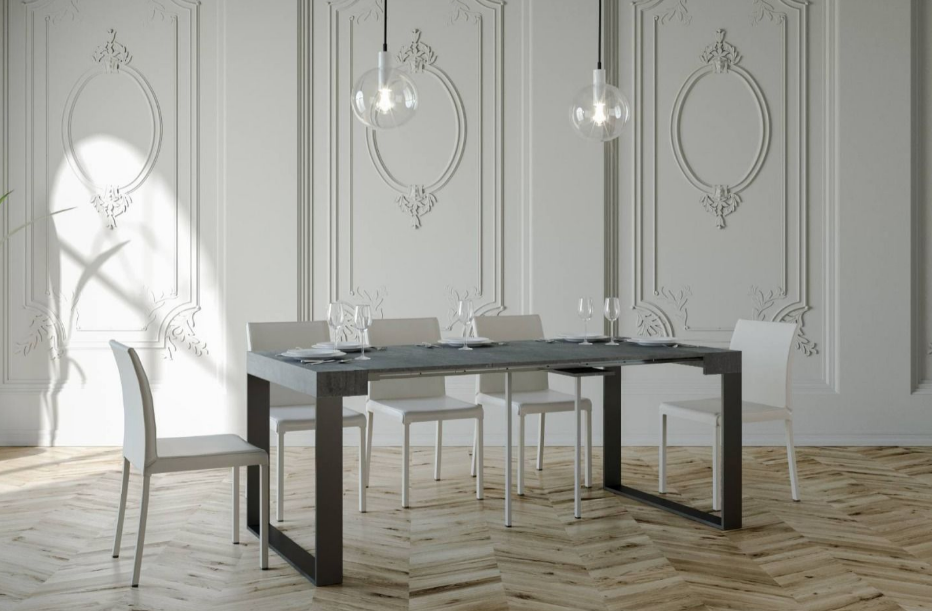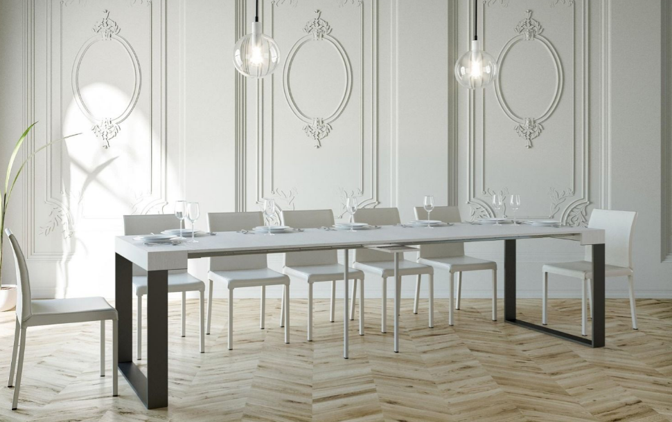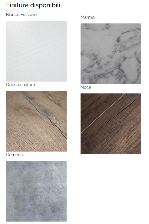 Il piano e le allunghe, nelle finiture bianco frassino, quercia natura, cemento, noce, marmo sono in microparticelle di legno rivestito, mentre il piano in abete natura e abete tinto è in legno listellare. Le allunghe sono nella stessa finitura del piano. Telaio in ferro verniciato antracite o nella scala Ral nei colori opachi.