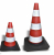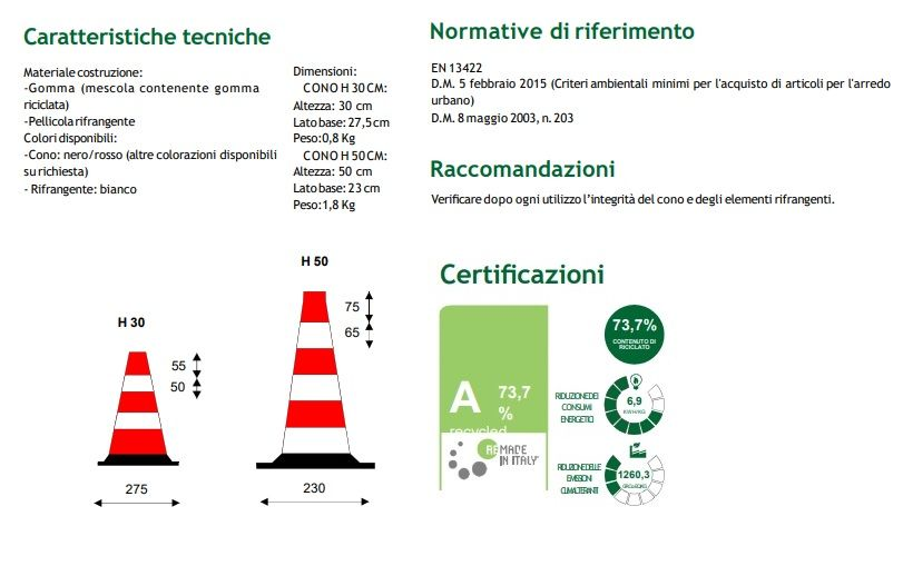 I coni stradali sono dei delimitatori di spazio di forma conica in gomma riciclata. I prodotti sono di colore rosso con strisce bianche rifrangenti, colori che li rendono particolarmente visibili a tutte le ore. Il cono è realizzato in gomma per garantire un’elevata elasticità dell’articolo. La parte conica è verniciata di rosso con vernici antinvecchiamento e, per rendere il cono visibile sia di giorno che di notte, viene applicata una pellicola rifrangente di classe II. La base, di colore nero, è dotata sia nella parte inferiore che superiore di piedini che facilitano l’impilazione dei coni e permettono il deflusso delle acque.