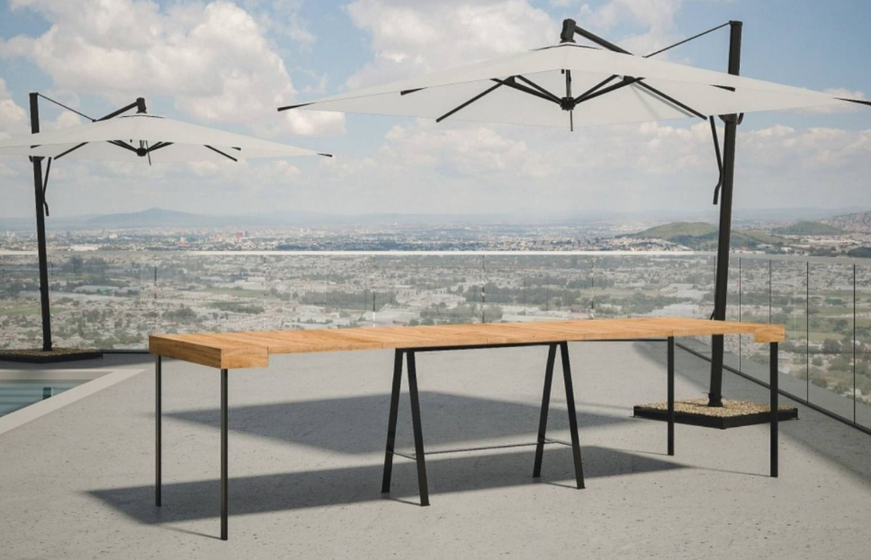 Iris, una consolle allungabile idale per arredare con gusto e stile ogni ambiente esterno ed interno. Dotata di solidità e stabilità uniche, Iris è perfetta per far accomodare in totale tranquillità fino a 14 persone. In pochi e semplici gesti è infatti possibile trasformarla in un comodo e pratico tavolo da pranzo. Made in Italy Una struttura in metallo verniciato antracite avorato con taglio al laser, garantisce una robustezza mai vista prima. I due sistemi di supporto (le gambe poste all'estremità quando la consolle è totalmente aperta) possono essere assemblati assieme per formare un carrello porta allunghe (esclusivamente con le allunghe in Abete semplici). Il legno con il quale è stata costruita la consolle (abete) è massello 100% naturale. Eventuali piccole imperfezioni sono da ritenersi caratteristiche intrinseche del materiale stesso e della lavorazione artigianale, e quindi perfettamente normali; anche il colore, nel tempo, se esposto alle intemperie o esposto alla luce diretta del sole, potrebbe subire leggere variazioni, anche queste variazioni sono assolutamente normali. E' possibile che si verifichi una leggera discrepanza tra il colore del piano e quella delle allunghe, dovuta al fatto che il piano è sempre esposto alla luce del sole, mentre le allunghe vengono in genere utilizzate meno di frequente. E' possibile che una leggera differenza si verifichi anche a contatto con la luce durante la permanenza nel nostro magazzino.