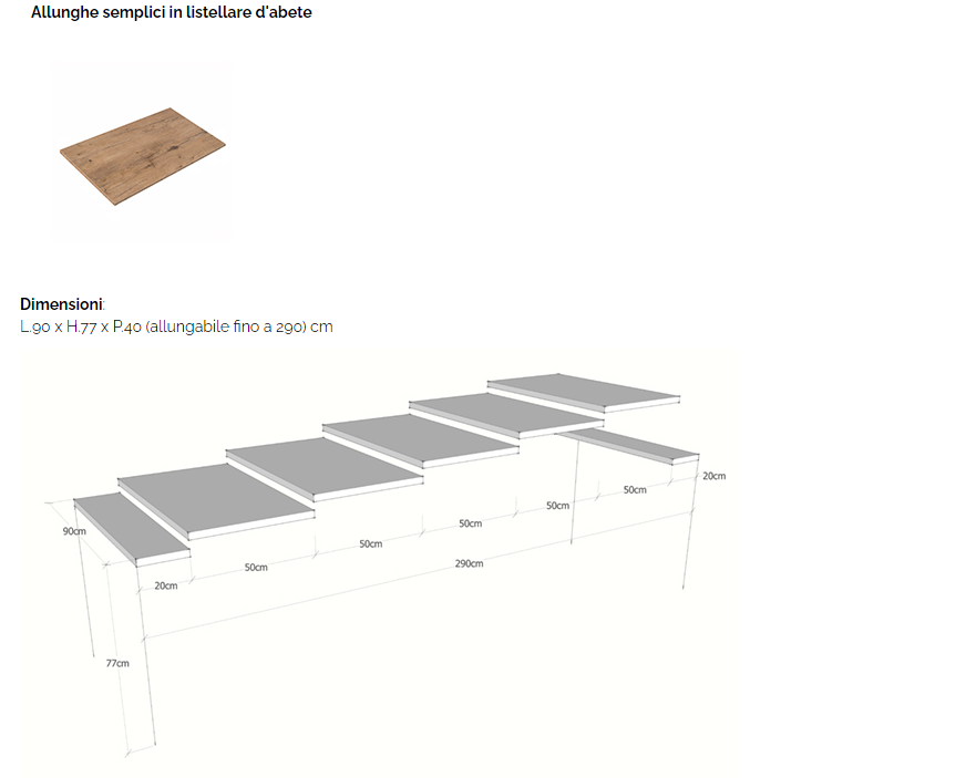 Caratteristiche tecniche: Piano in legno listellare d'abete lavorazione tipo folding (adatto per l'esterno) Allunghe in listellare d'abete semplici (adatte per l'esterno)