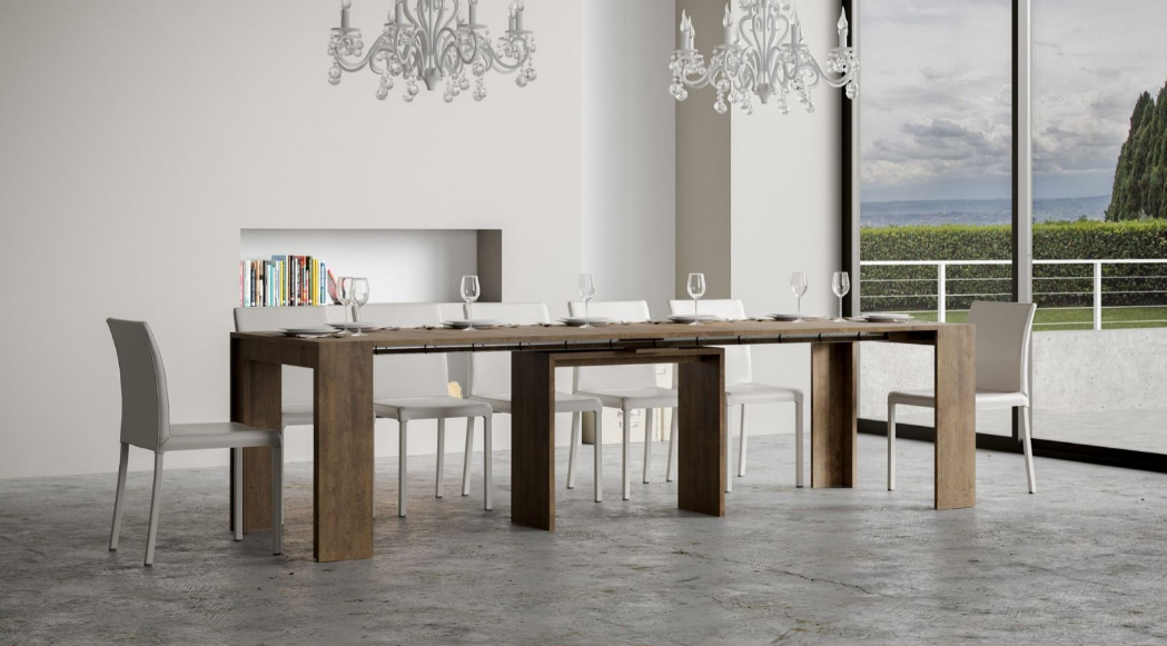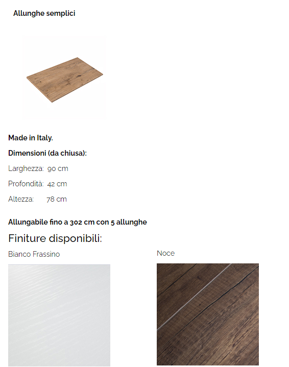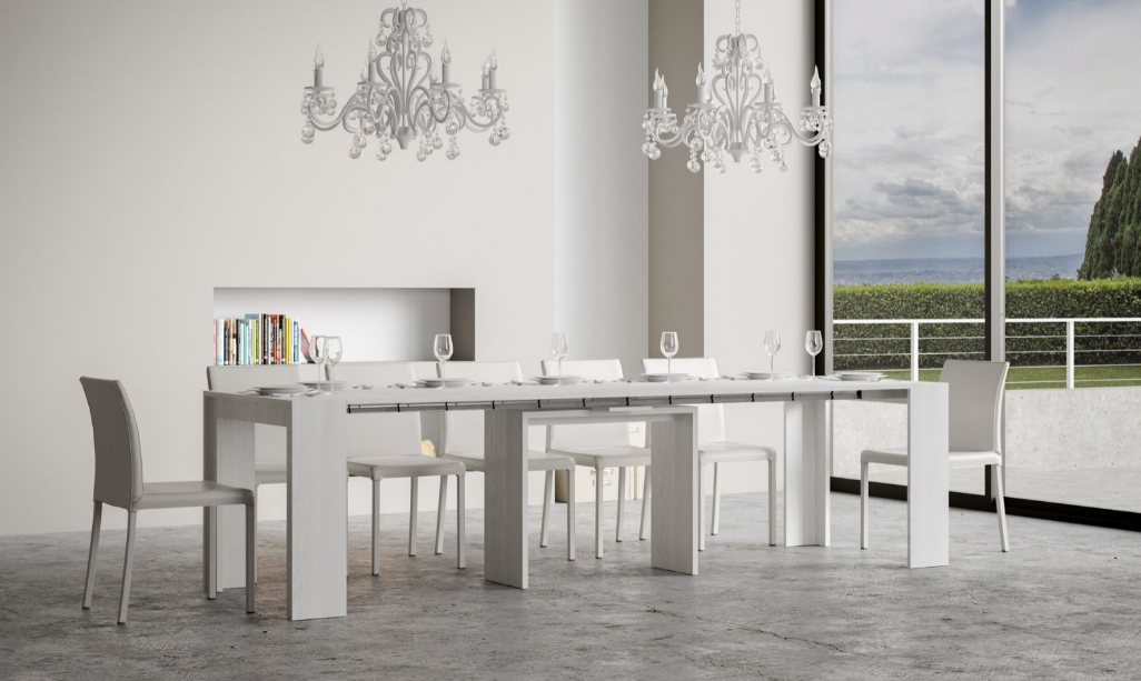 La consolle MIA è estremamente stabile e robusta, pronta per ospitare tutti i tuoi ospiti in totale relax. Ha il supporto centrale in legno, della stessa finitura della consolle; lo stesso ruota dando la possibilità di non interferire con le gambe delle persone che vi si siedono in prossimità. La consolle Mia è particolarmente robusta e stabile grazie all'ampia area di appoggio a terra. La consolle Mia può in un attimo trasformarsi in un piano di 3,02 metri nelle occasioni più importanti grazie alle pratiche 5 allunghe fornite in dotazione. Consolle realizzata in nobilitato melaminico. Possibilità di scelta tra due finiture, bianco frassino e noce. Realizzata interamente in Italia mediante l'utilizzo di materiali 100% italiani. Composta essenzialmente da due parti: il piano superiore allungabile con sistema di guide in alluminio ad elevata scorrevolezza. Spazioso e robusto. N.B. E' POSSIBILE RICEVERE IL PRODOTTO GIA' MONTATO CON SPESA AGGIUNTIVA DI € 80,00 + IVA