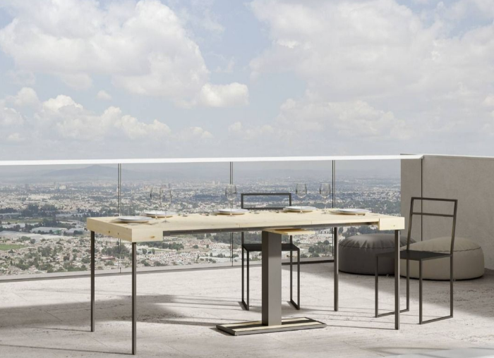 Mimosa Small è una consolle da giardino estremamente elegante e versatile. Le gambe sottili ma solde donano una linea unica al modello, studiato appositamente per ambienti esterni, ma adatto anche per interni. Struttura in metallo verniciato antracite lavorato al pantografo, con piano in legno listellare d'abete. Disponibile nella configurazione a tre allunghe, si converte comodamente in un pratico tavolo da pranzo di due metri in grado di ospitare fino a 10 persone. Made in Italy